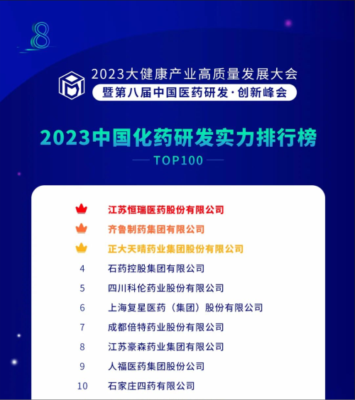 由药智网、中国药业杂志社主办的2023大健康产业高质量发展大会暨第八届中国医药研发•创新峰会于6月16日开幕,会上发布了《2023中国药品研发实力排行榜》系列榜单,永利娱乐城医药凭借深厚的创新研发实力再创辉煌:荣登《2023中国药品研发综合实力排行榜TOP100》榜首、《2023中国化药研发实力排行榜TOP100》榜首。值得一提的是,今年是永利娱乐城医药连续第6年入选《中国药品研发综合实力排行榜》榜首。