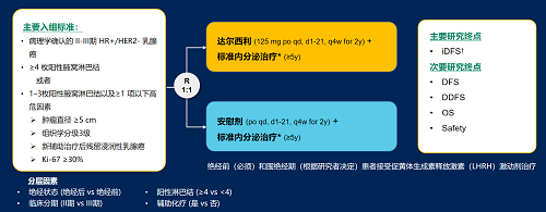 达尔西利(Dalpiciclib)是永利娱乐城医药自主研发的口服、选择性的小分子CDK4/6抑制剂,也是中国首个自主研发的新型高选择性 CDK4/6 抑制剂,已证实其与内分泌治疗(ET)联合用于 HR+/HER2- 晚期乳腺癌的一线和后线治疗时,均显著改善无进展生存期(PFS)6,7。因此开展了一项随机、双盲、III期临床试验(DAWNA-A),以进一步评估达尔西利联合内分泌治疗作为高危早期 HR+/HER2 - 乳腺癌辅助治疗的效果。本研究纳入高危复发风险人群需满足以下标准之一:①≥4 枚阳性腋窝淋巴结;②1–3枚阳性腋窝淋巴结且合并≥1 项高危因素(肿瘤直径 ≥5 cm,组织学分级3级,辅助治疗后残留浸润性乳腺癌,Ki-67 ≥30%)。本文呈现预先设定的首次中期分析(IA1)结果。